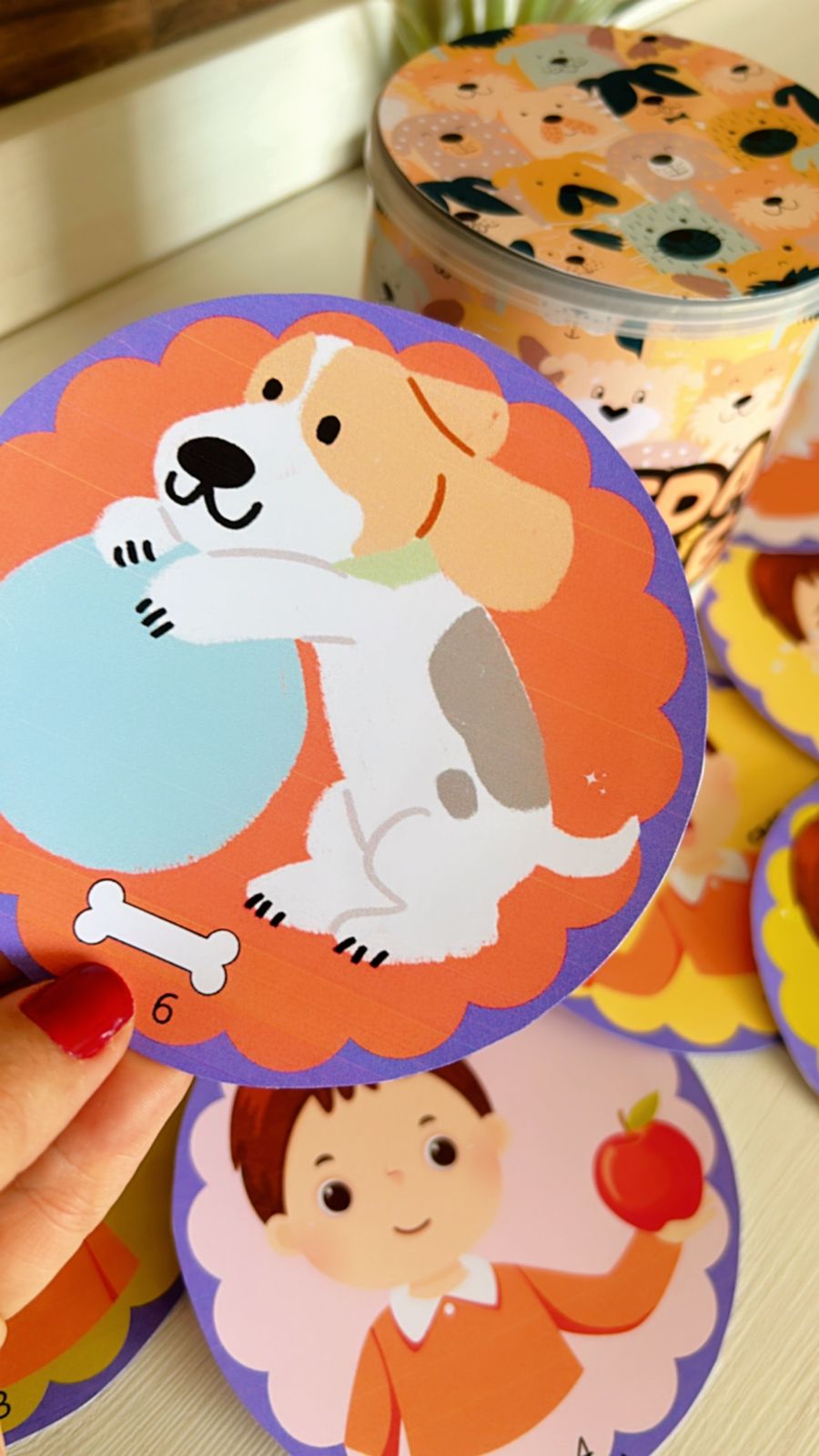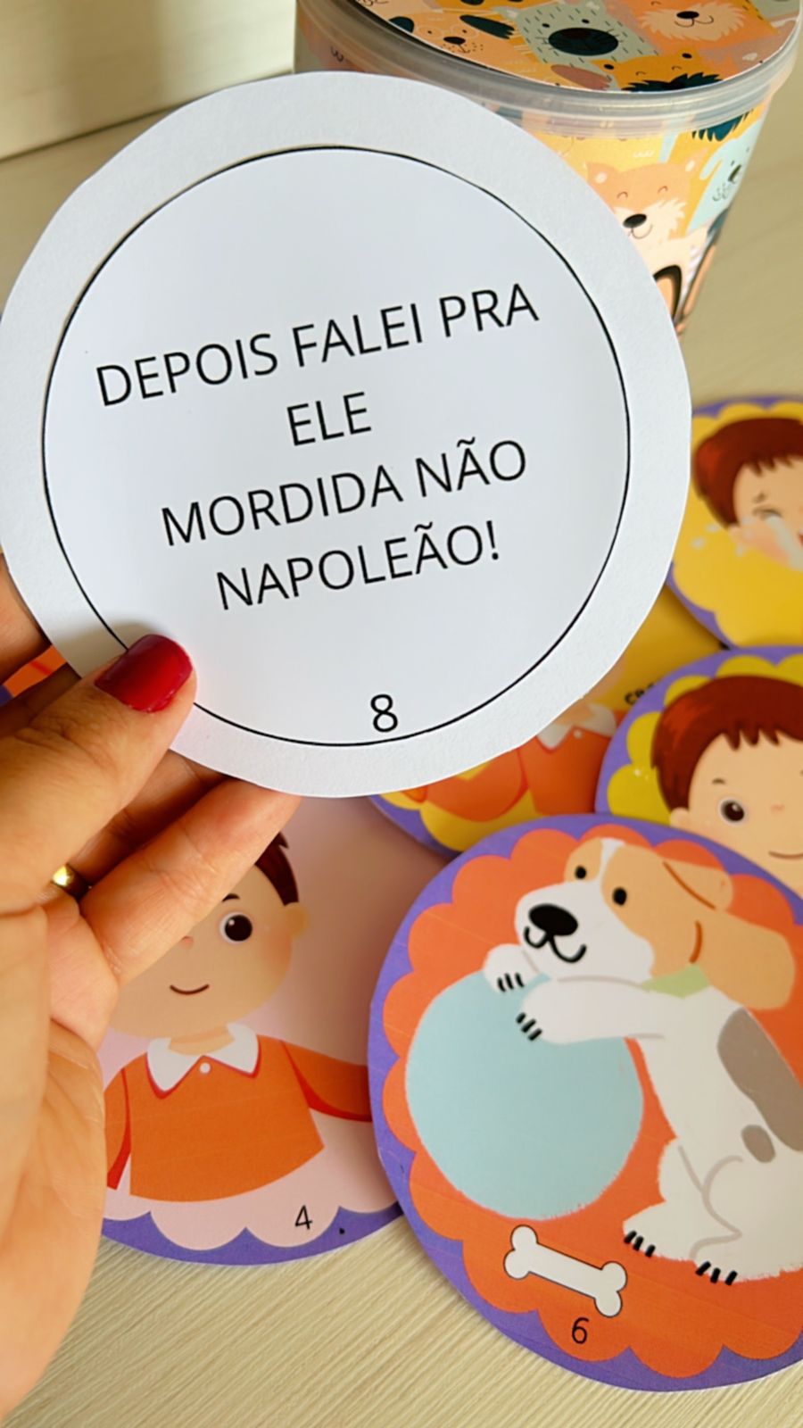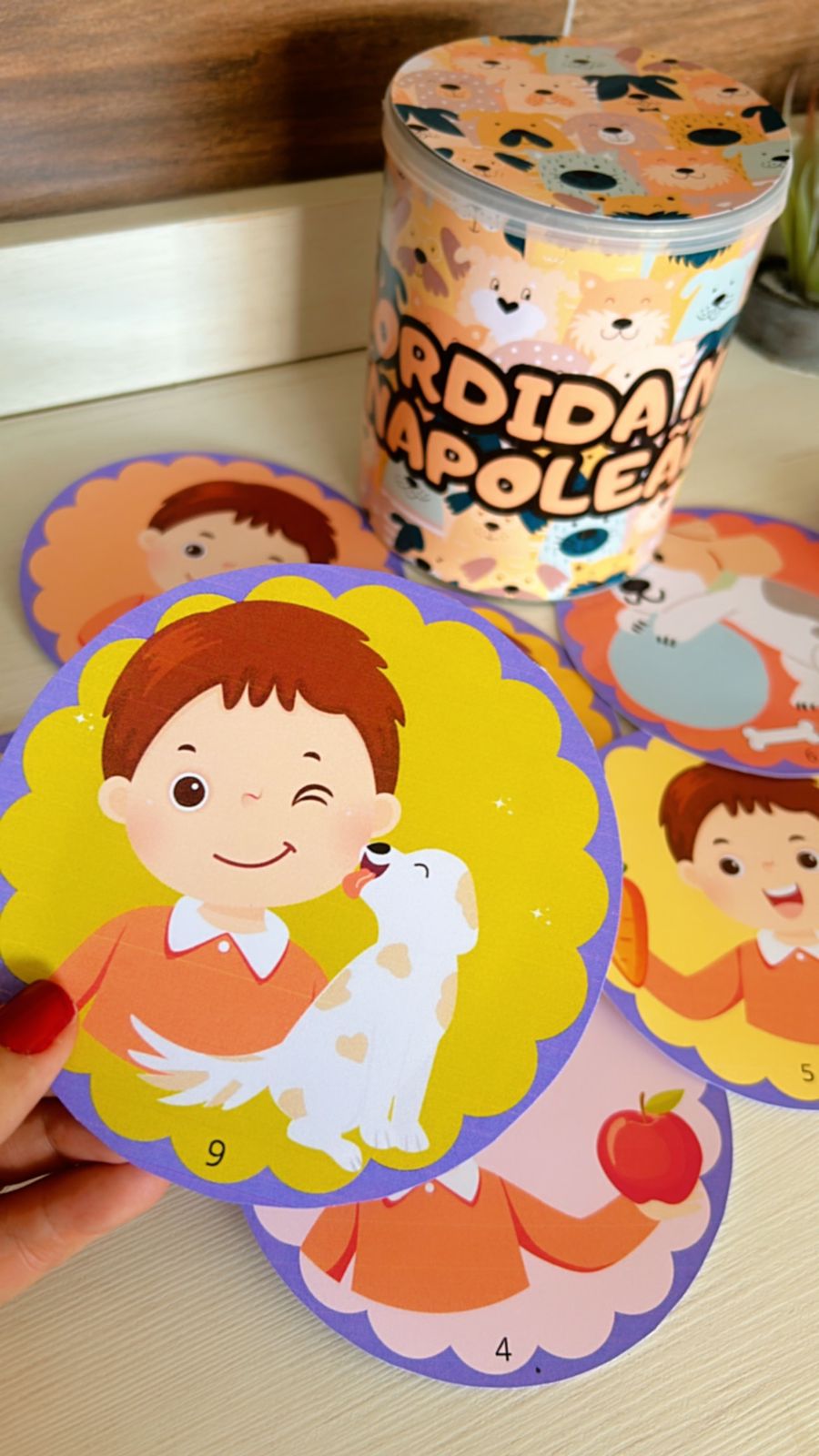 No arquivo vem a arte para a lata de 400 e 800gr, as fichas com as imagens e a história escrita para colar atrás.