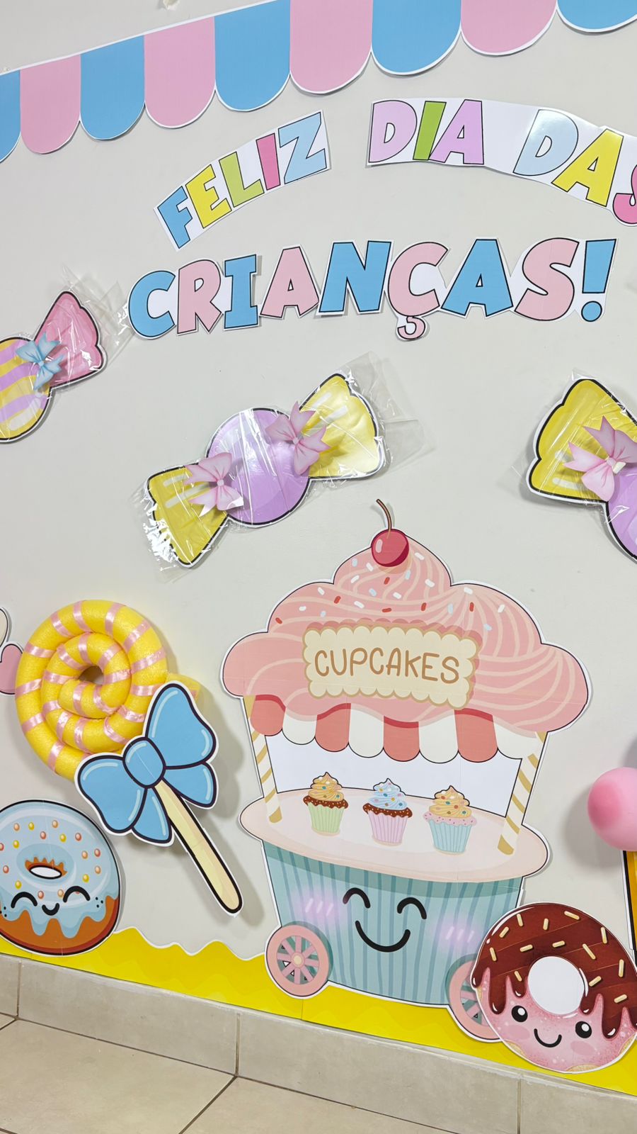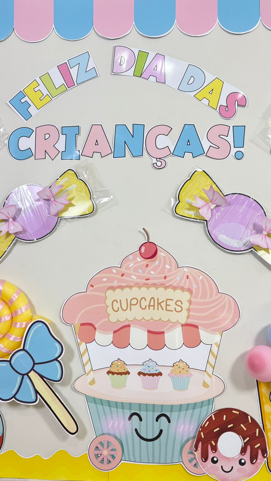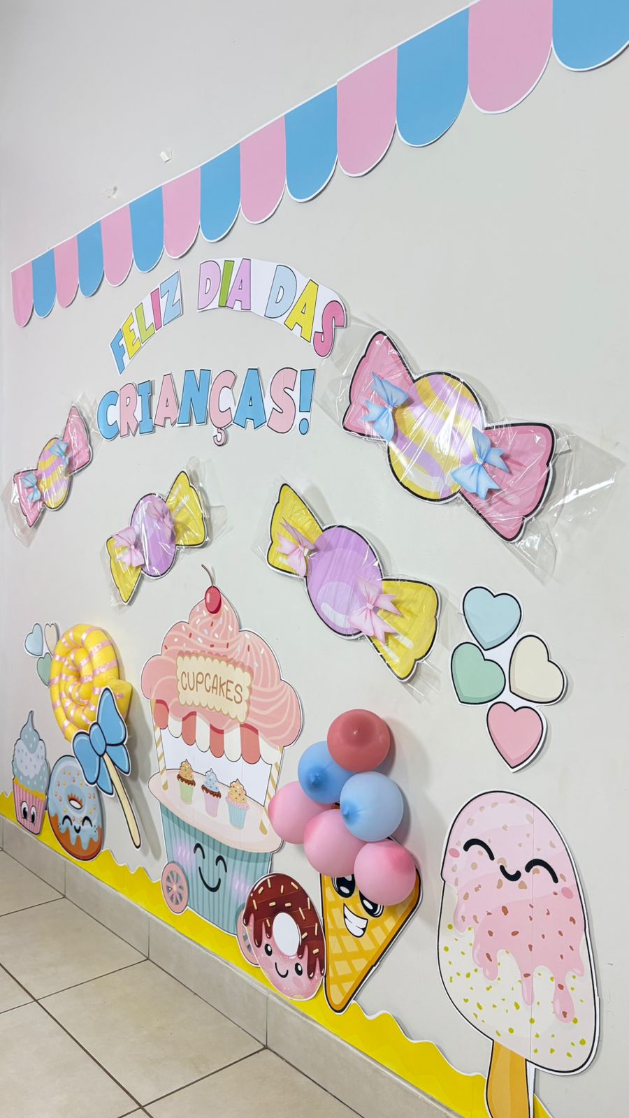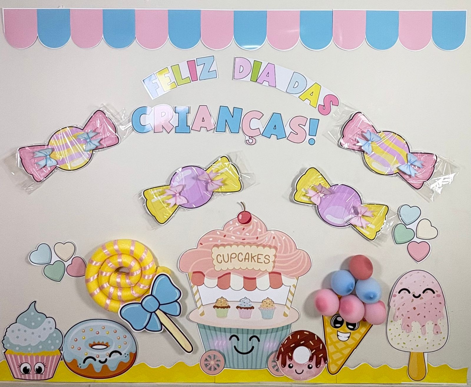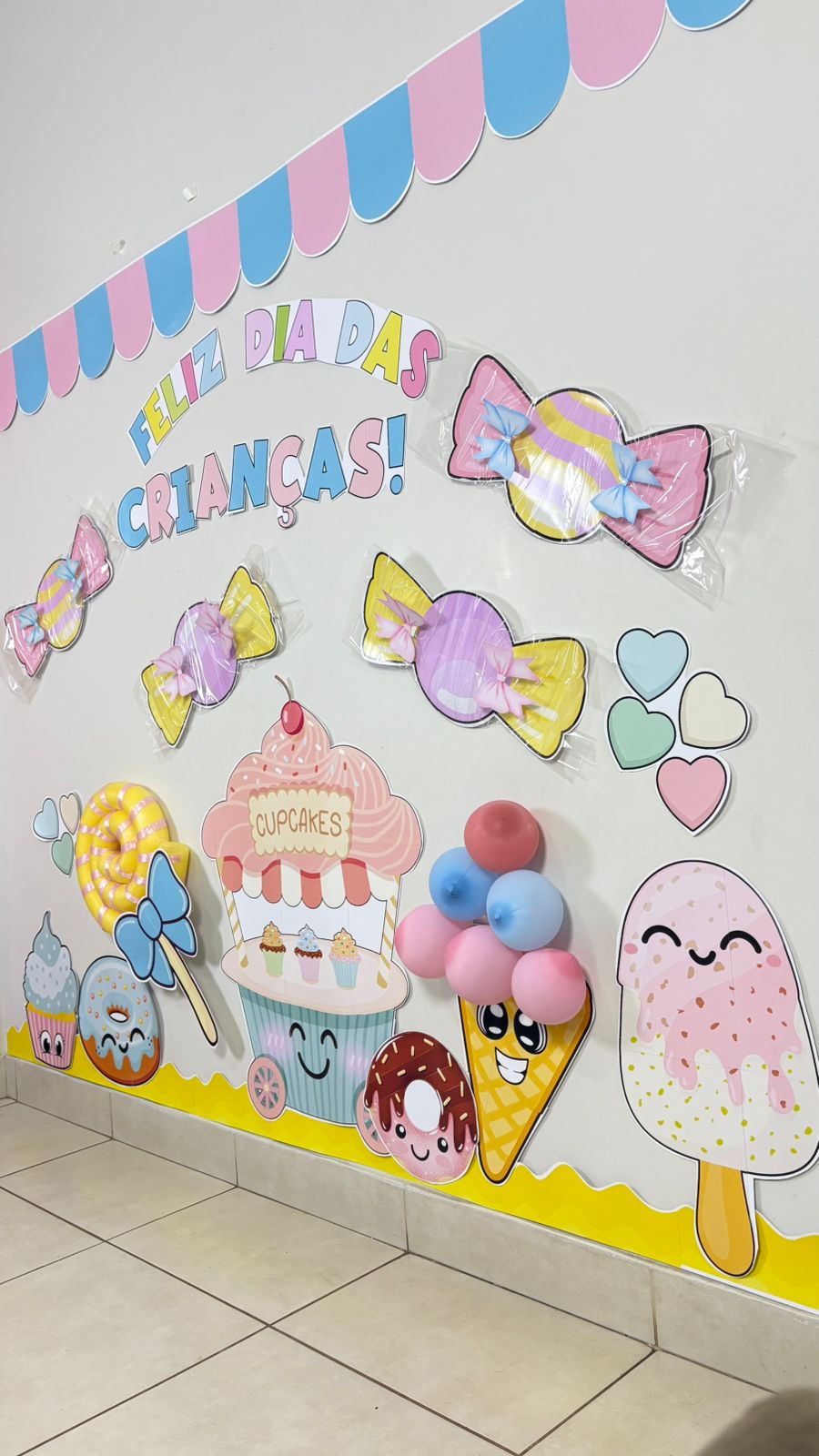 Apresente seu amor e carinho com este Painel de Dia das Crianças Doces Encantados: decorado com doces fofinhos e tons pastéis delicados, ele traz uma beleza singela que vai derreter corações! 💛