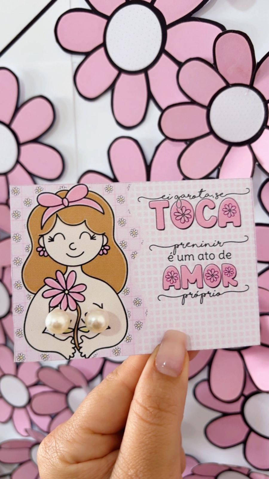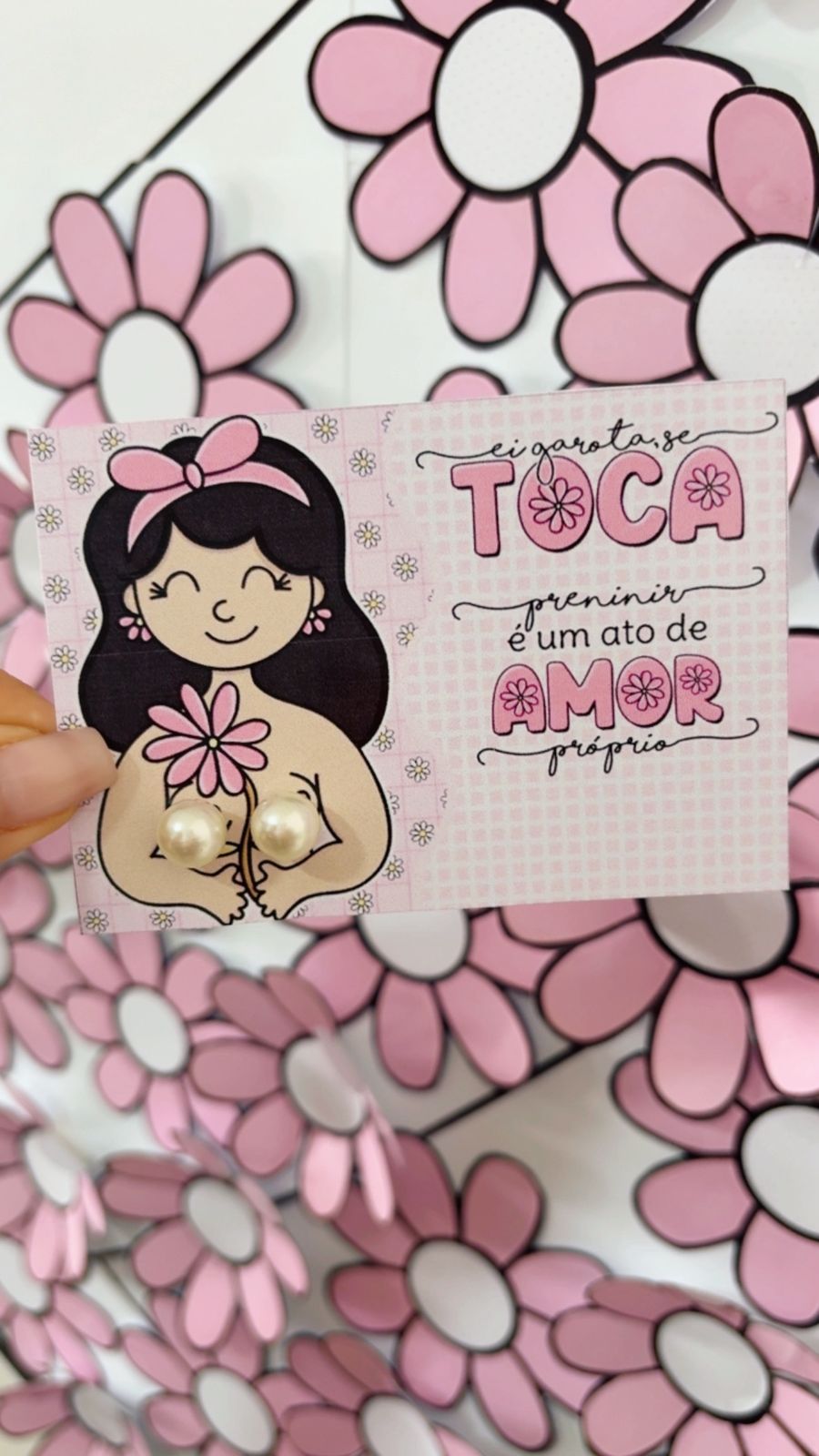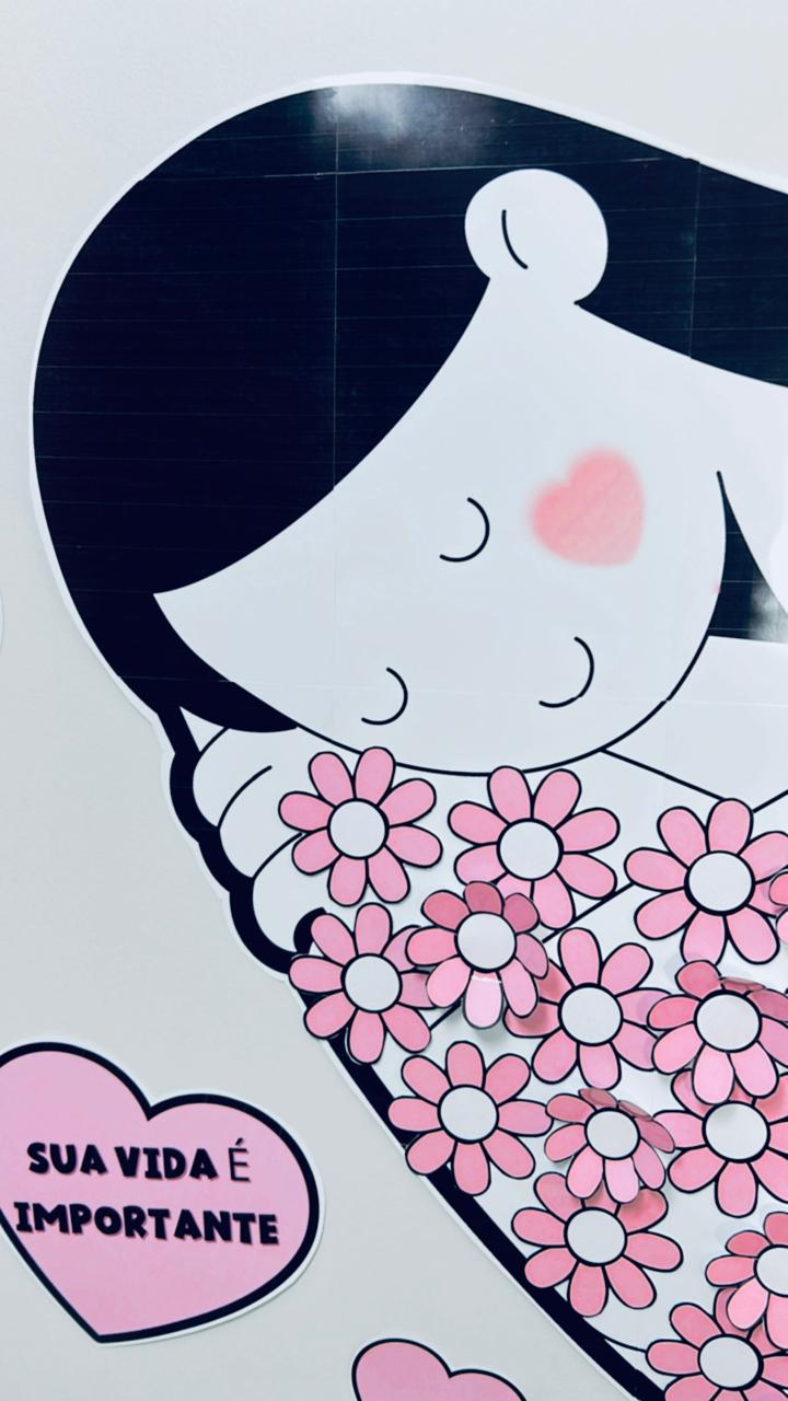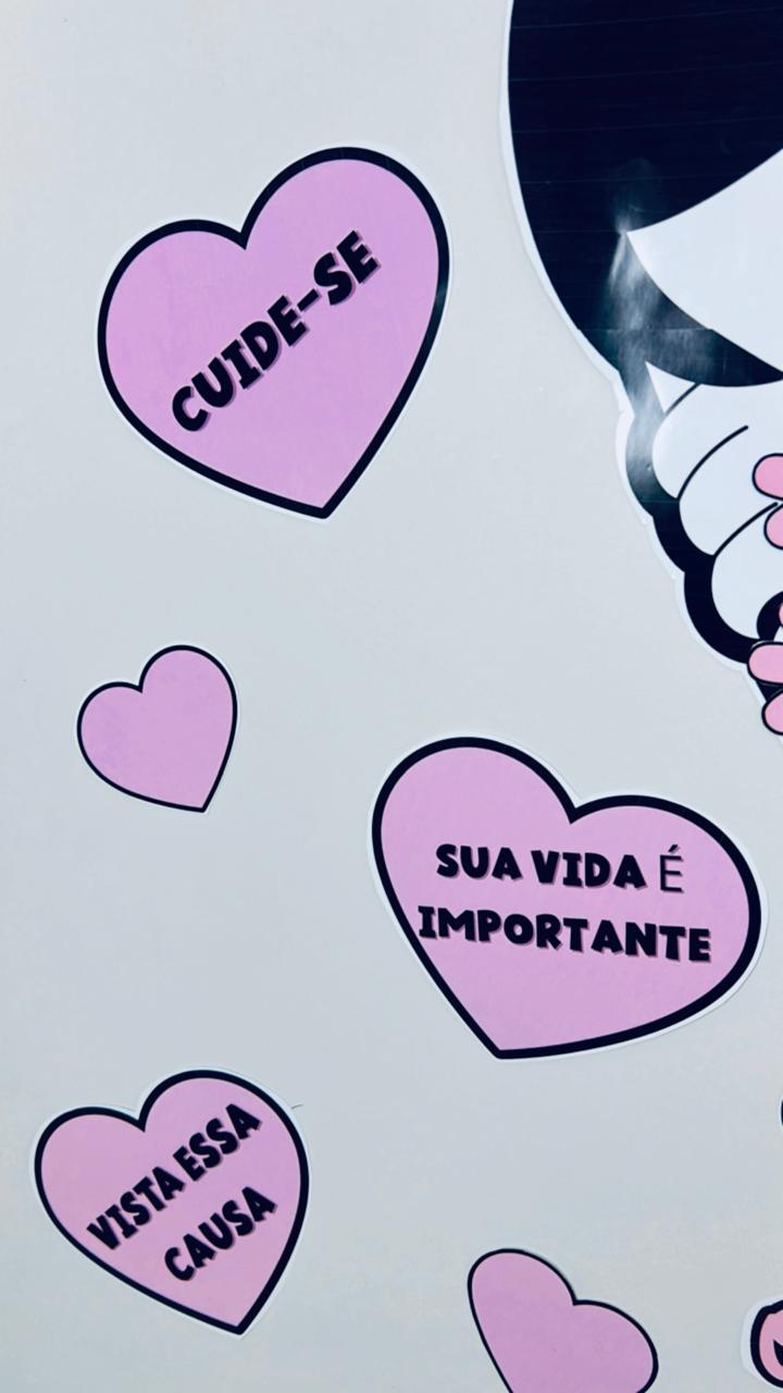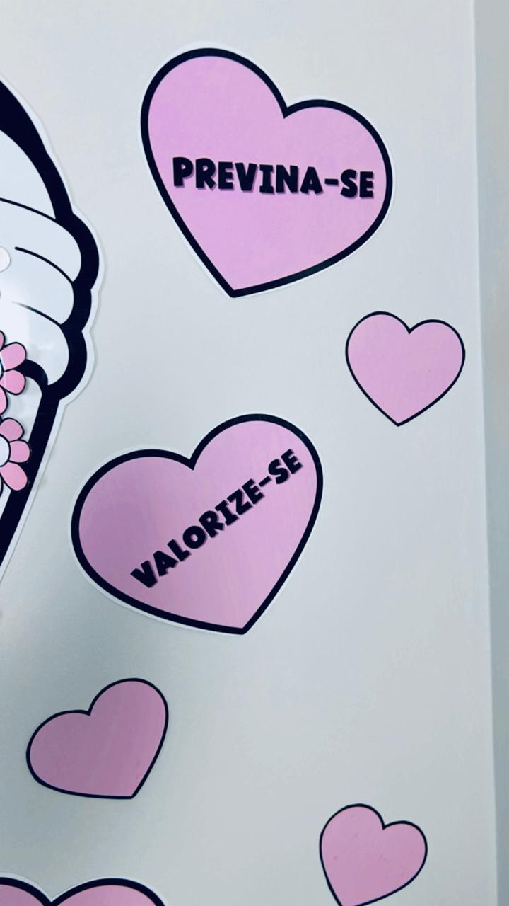 🌸🩷A decoração inclui corações menores com mensagens de incentivo como “CUIDE-SE”, “PREVINA-SE”, “SUA VIDA É IMPORTANTE”, “VALORIZE-SE” e “SE AME”.💝
